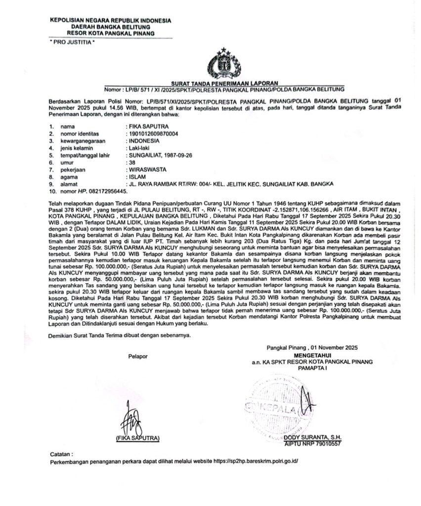 Laporan kepoliaian itu dengan nomor : LP/B/ 571 / Xl 12025/SPKT/POLRESTA PANGKAL PINANG/POLDA BANGKA BELITUNG, tanggal 01 November 2025 pukul 14.56 WIB. bertempat di kantor kepolisian tersebut di atas, pada hari, tanggal dltanda tanganinya Surat Tanda Penerimaan Laporan, dengan inl diterangkan bahwa: