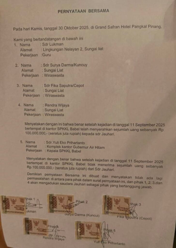 Ketiga nama di atas tersebut (Lukman, Kuncui & Rendra Wijaya) dalam surat pernyataan bersama yang ditandatangani di Grand Safran hotel, jalan Soekarno Hatta Kota Pangkal Pinang berisikan jika ketiganya mengakui telah menyerahkan uang senilai Rp 100.000,- setelah kejadian tanggal 11 September 2025 kepada seorang oknum berinisial Joh (stafsus Gubernur Babel).