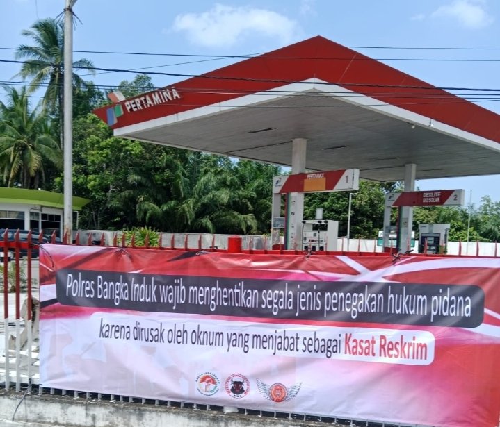 Selain itu, tulisan atau kalimat sindiran pun dapat dilihat terpasang di salah satu SPBU di Kota Sungailiat, Bangka yakni ‘Polres Bangka Wajib Menghentikan Segala Jenis Penegakan Hukum Pidana Karena Dirusak Oleh Oknum Sebagai Kasat Reskrim’.